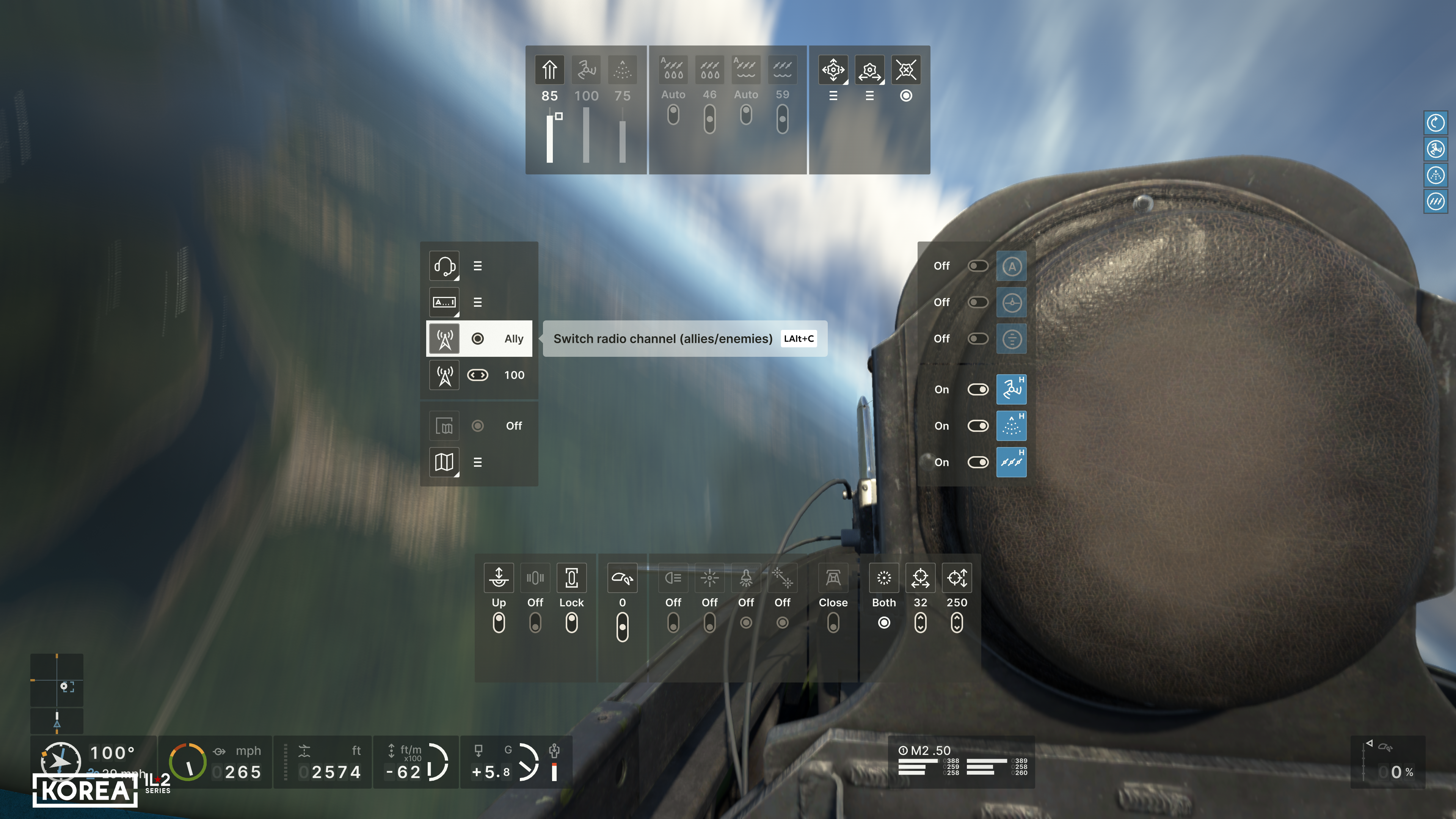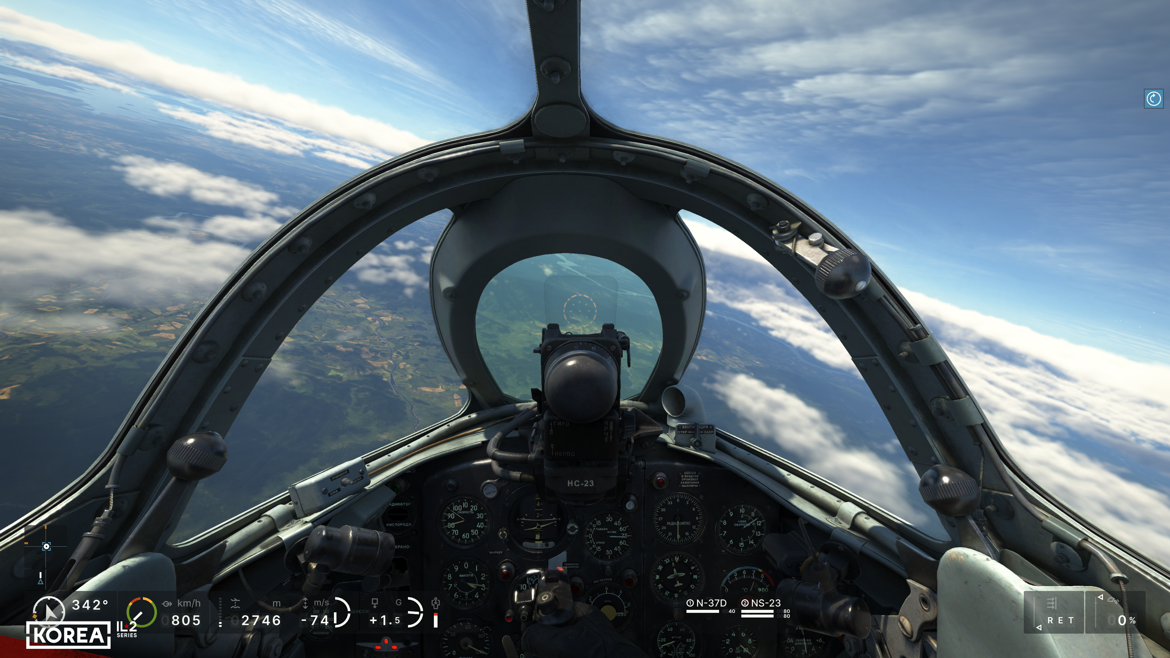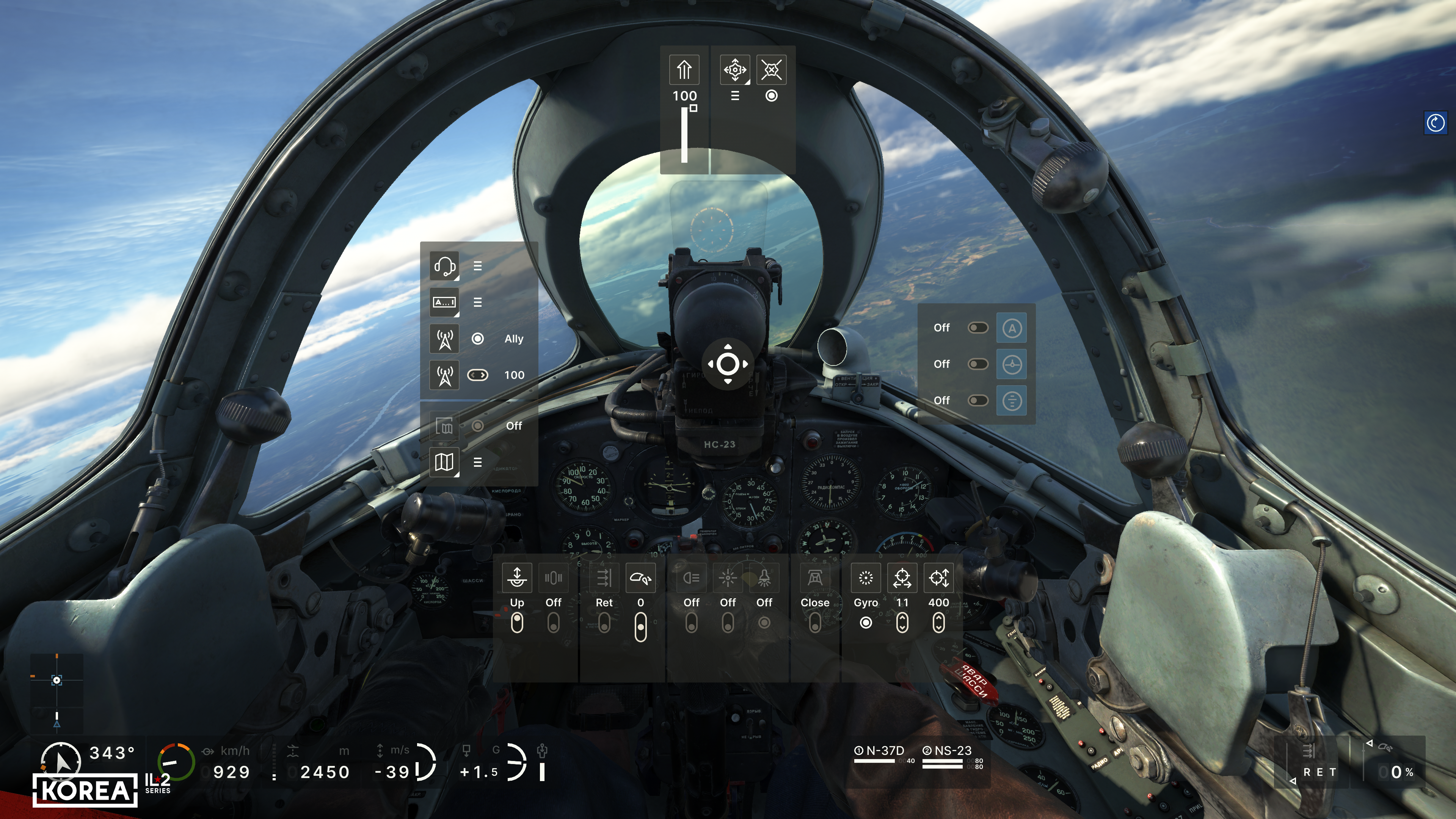 First, we decided to show the user much more detailed information about their aircraft. In addition to the basic flight parameters (course, altitude, speed, Mach number, G load, vertical speed), the main engine parameters (RPM, boost, temperature), the positions of all the main controls, the status of landing gear, flaps, brakes, and the remaining ammo, underwing weapons, and fuel will be available. Of course, not everyone needs a comprehensive set of HUD indicators, so we have provided simplified versions that display only the essential information. At the same time, the player can read the remaining parameters from the actual instruments in the 3D cockpit. The indicators include not only the current flight parameters but also their limits, allowing you to learn to fly and control a new aircraft much faster.
