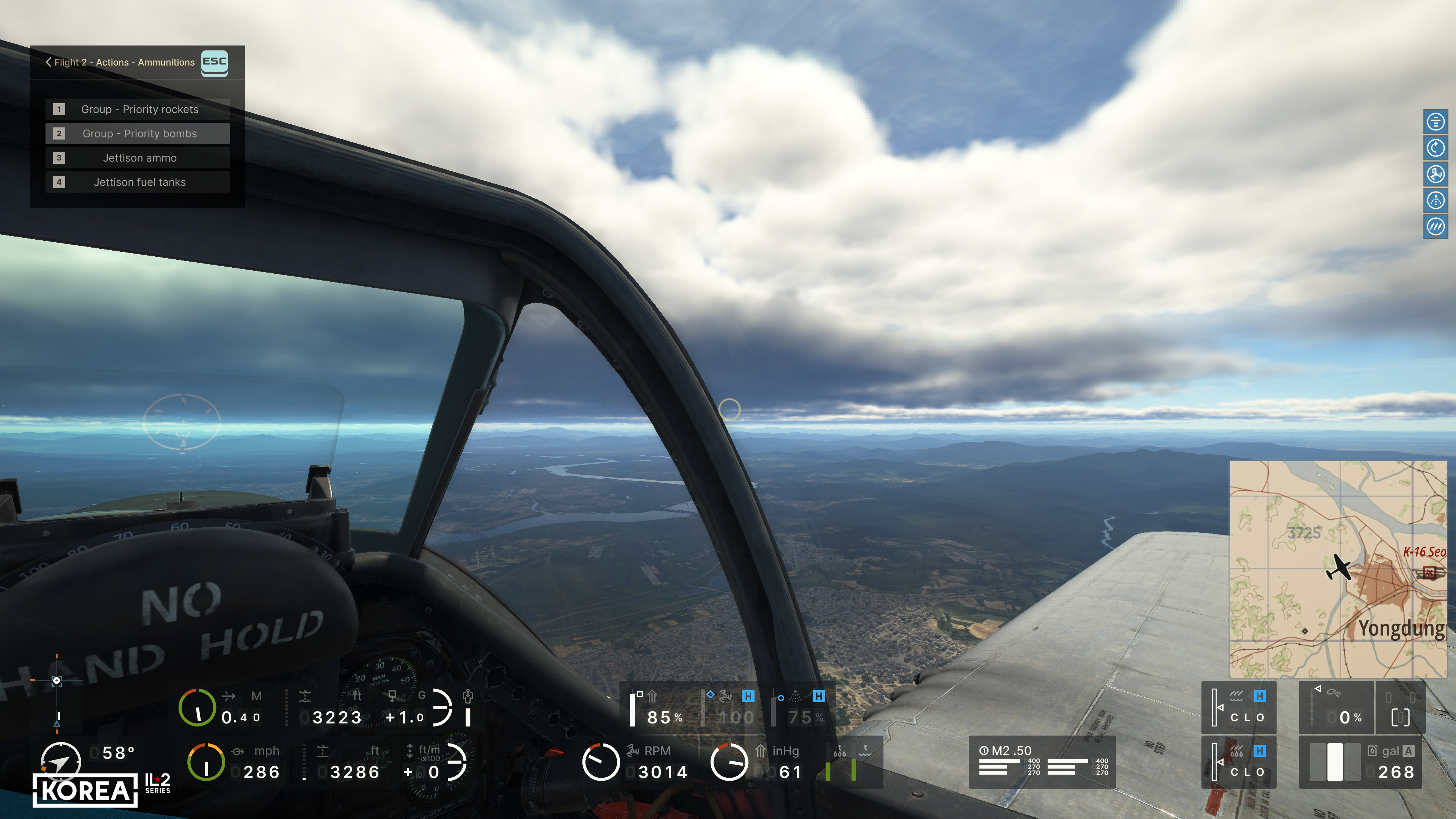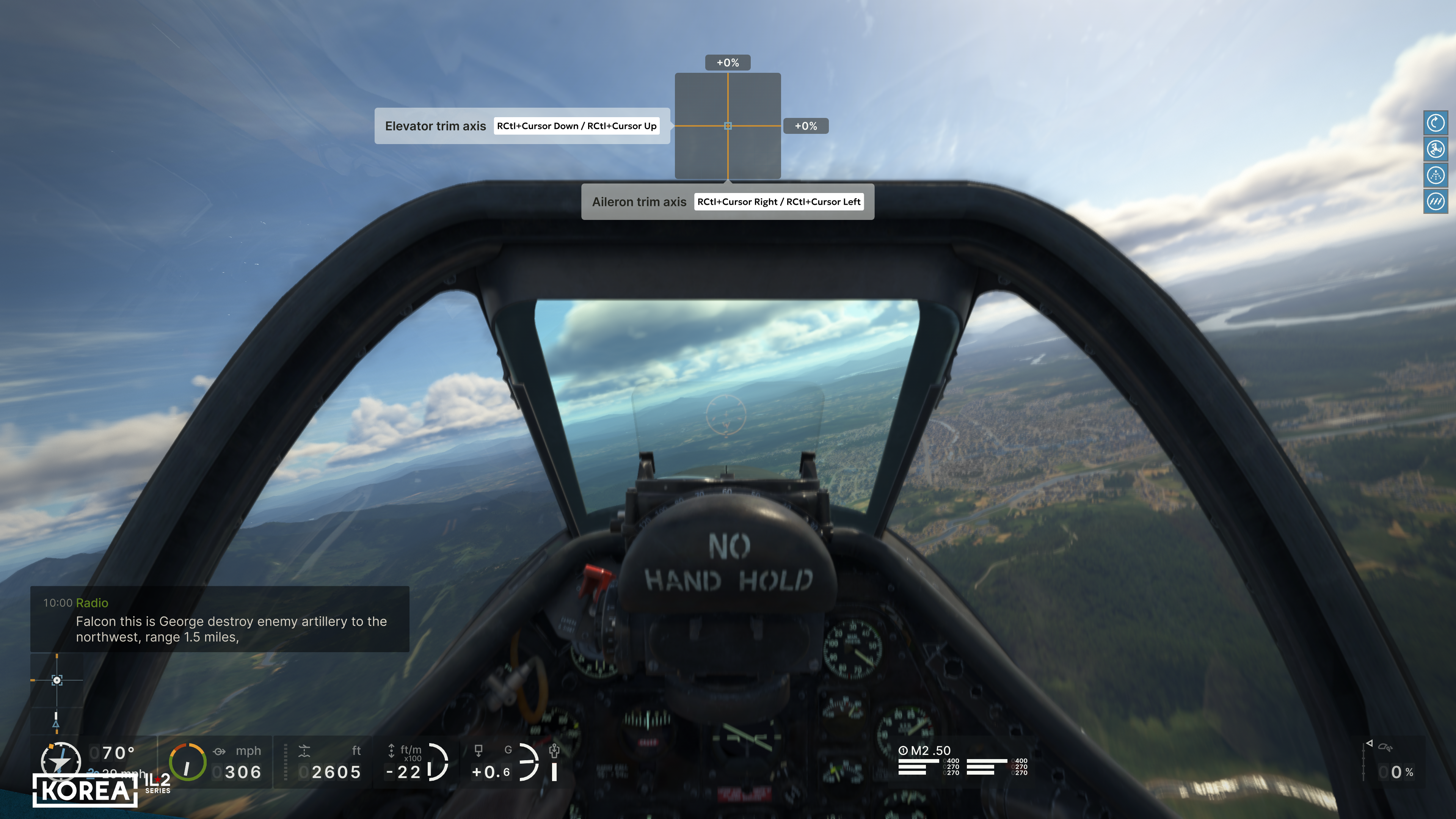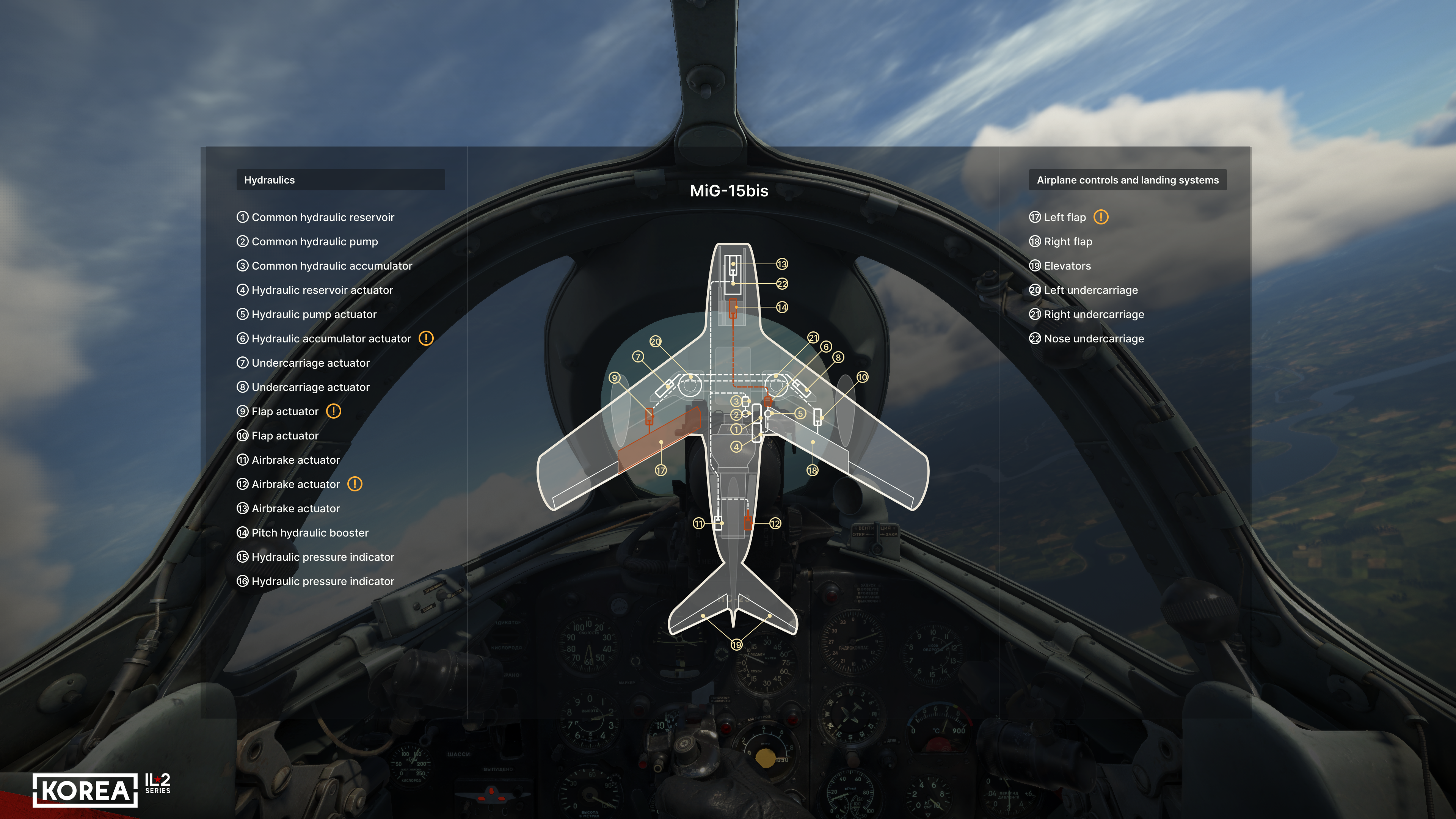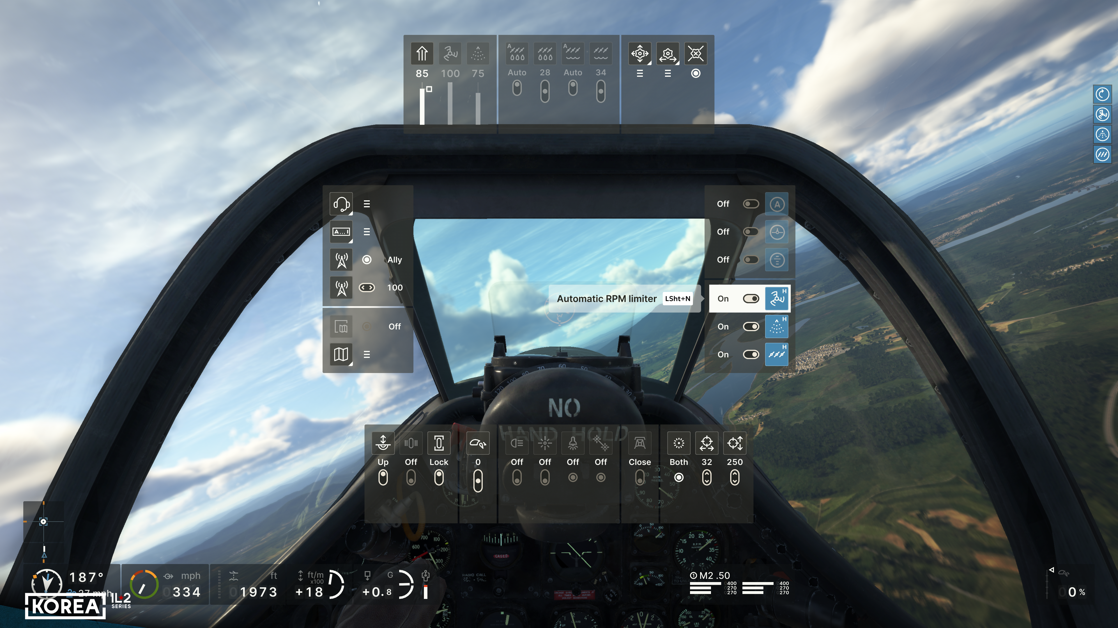 First, we decided to show the user much more detailed information about their aircraft. In addition to the basic flight parameters (course, altitude, speed, Mach number, G load, vertical speed), the main engine parameters (RPM, boost, temperature), the positions of all the main controls, the status of landing gear, flaps, brakes, and the remaining ammo, underwing weapons, and fuel will be available. Of course, not everyone needs a comprehensive set of HUD indicators, so we have provided simplified versions that display only the essential information. At the same time, the player can read the remaining parameters from the actual instruments in the 3D cockpit. The indicators include not only the current flight parameters but also their limits, allowing you to learn to fly and control a new aircraft much faster.